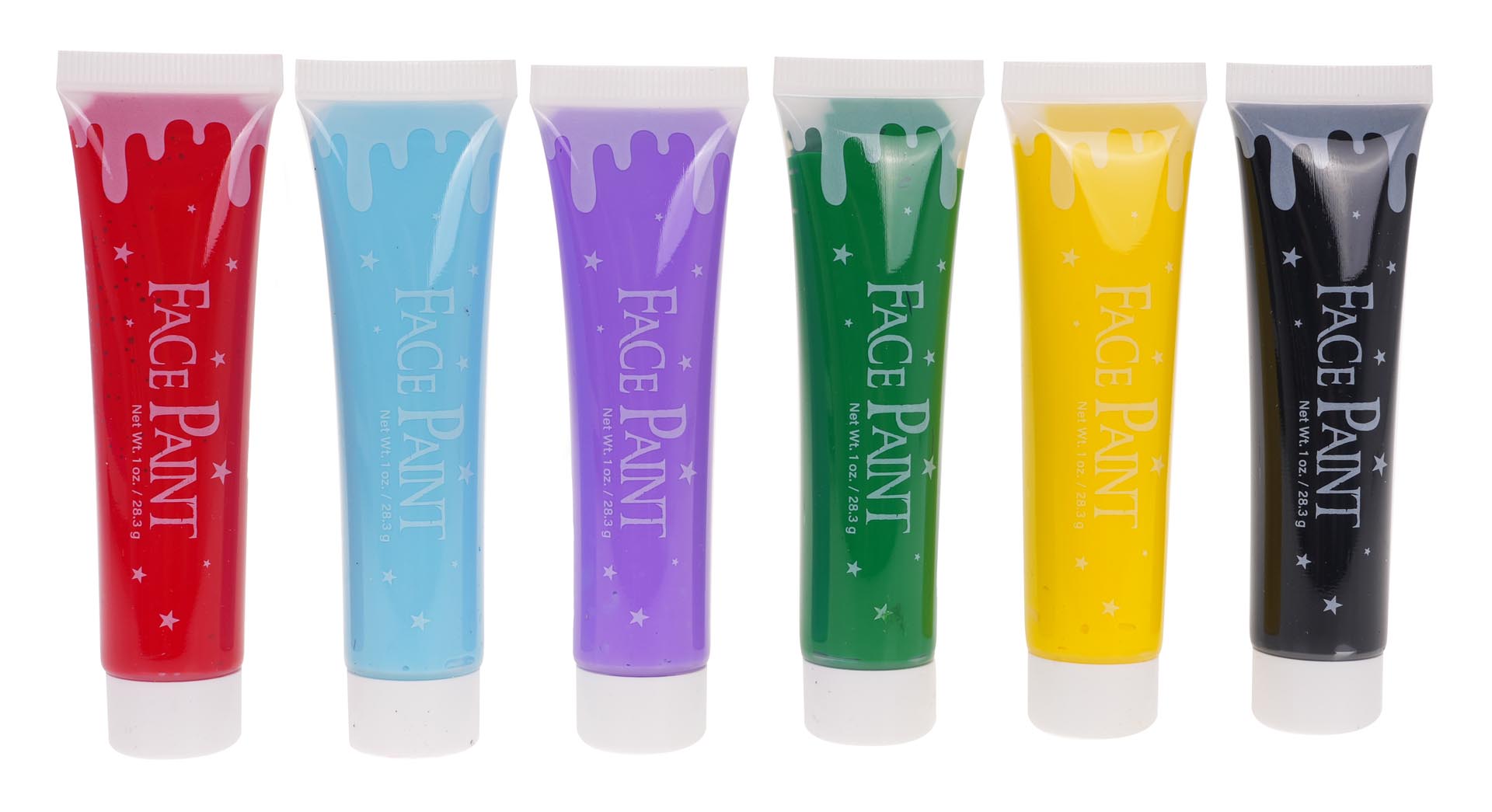 | - 6 x farbka do twarzy w tubce (czarna, żółta, zielona, fioletowa, niebieska, czerwona). |