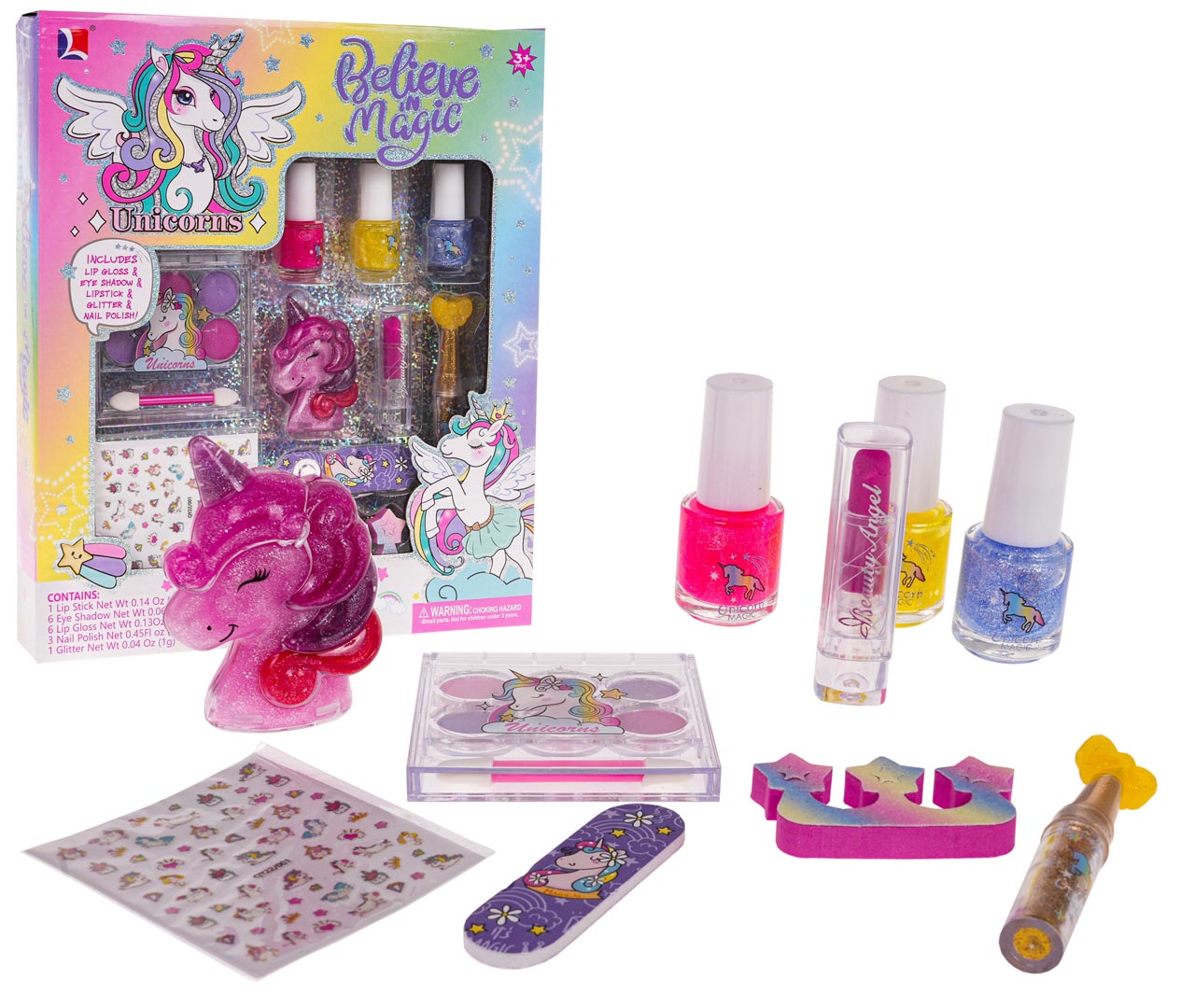 | - cienie do powiek 6 sztuk w różnych kolorach, - pędzelek do cieni, - naklejki dekoracyjne na paznokcie, - 3 x brokatowy lakier, - błyszczyk do ust w pudełku o kształcie jednorożca, - szminka, - aplikator z brokatem, - pilnik do paznokci z jednorożcem, - separator do palców. |
