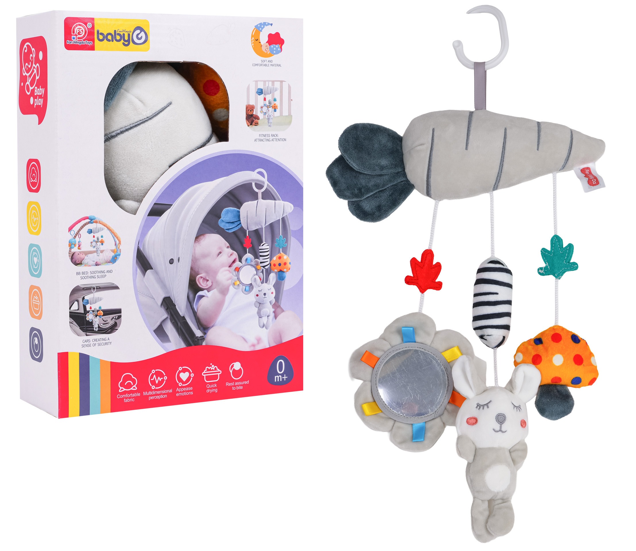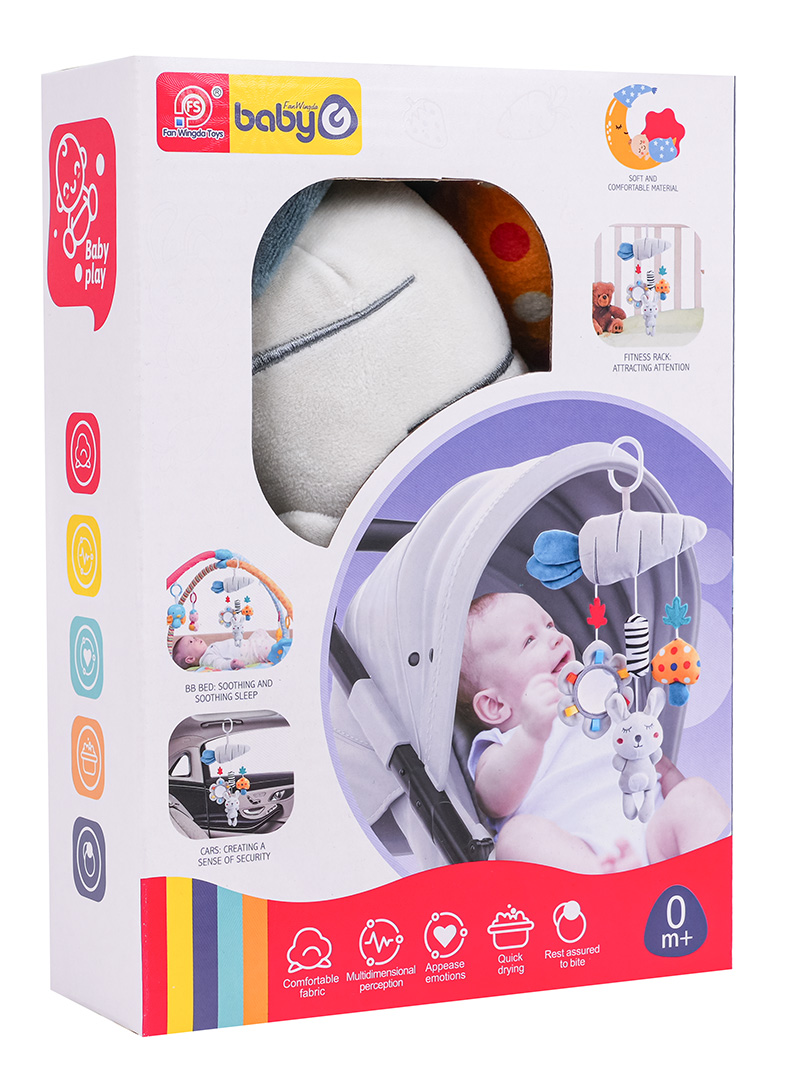 | Sensoryczna zawieszka do wózka, łóżeczka lub fotelika dla dzieci od pierwszych dni życia. Zestaw wykonano z miękkich i bezpiecznych dla dziecka materiałów, najlepszej jakości. Stymuluje zmysły maluszka na wielu płaszczyznach. Poszczególne elementy szeleszczą lub grzechoczą, a żywe kolory przyciągają uwagę dziecka i zachęcają do zabawy.