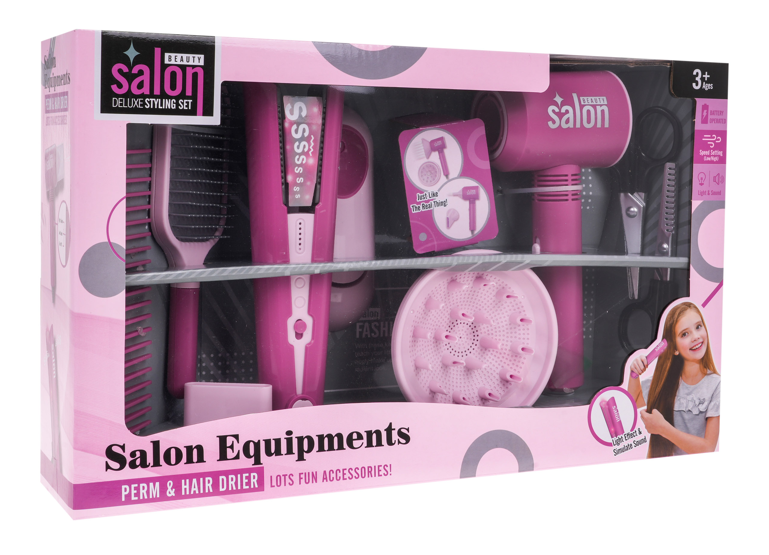 Interaktywny, bogato wyposażony zestaw fryzjerski z suszarką z wymiennymi dyszami i prostownicą do włosów na baterie to propozycja dla dzieci od 3- go roku życia. W zestawie znaleźć możemy szeroką gamę narzędzi niezbędnych w pracy fryzjera w tym suszarkę, prostownicę, nożyczki, grzebienie do włosów i inne akcesoria. Suszarka do włosów wydaje odgłos suszenia i emituje strumień powietrza. Posiada dwustopniową regulację stopnia nawiewu, a podczas suszenia wydaje odgłosy jak prawdziwa. Prostownica posiada efekty świetlne oraz odgłosy towarzyszące prostowaniu włosów. Suszarka do włosów zasilana jest bateriami typu 3 x AAA (brak w zestawie), prostownica bateriami 2 x AAA (brak w zestawie). Funkcje zestawu: - suszarka z wymiennymi nasadkami (dyfuzor i nasadka skupiająca), - suszarka emituje strumień powietrza, - suszarka posiada dwustopniową regulację stopnia nawiewu, - suszarka wydaje odgłosy suszenia, - prostownica posiada suwak do zamykania i otwierania, - prostownica posiada oświetlenie, - prostownica wydaje odgłosy charakterystyczne dla prostowania włosów, - praktyczny stojak na suszarkę. | |