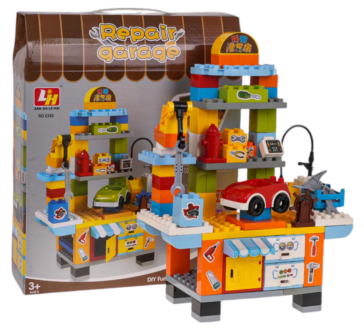 | - klocki konstrukcyjne 110 elementów w tym: * autko, * skrzynka narzędziowa, * śrubokręty, * klucz francuski, * maszyna do pompowania kół, * podnośnik |