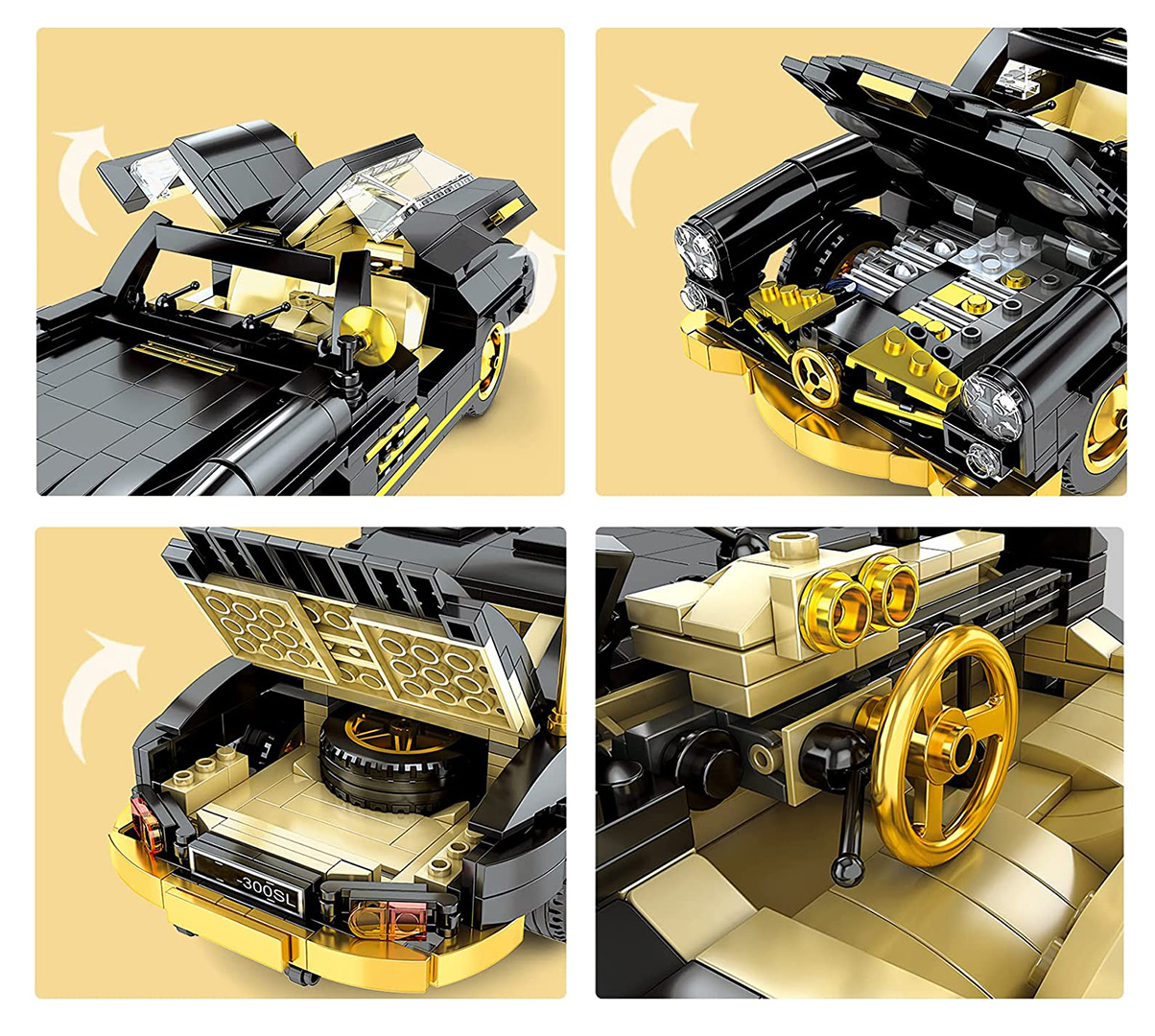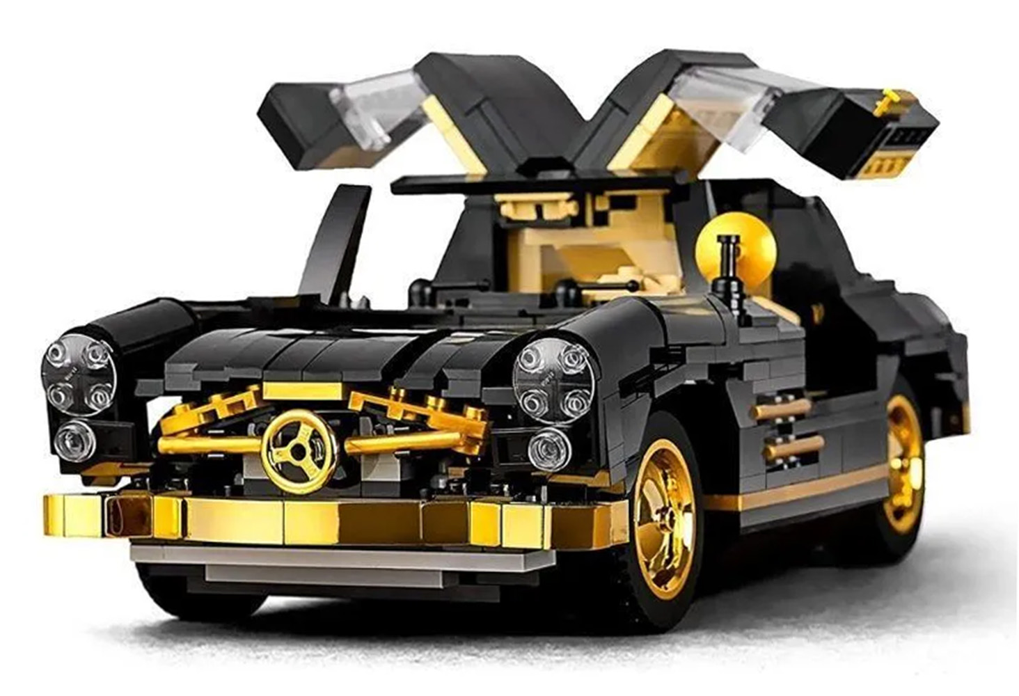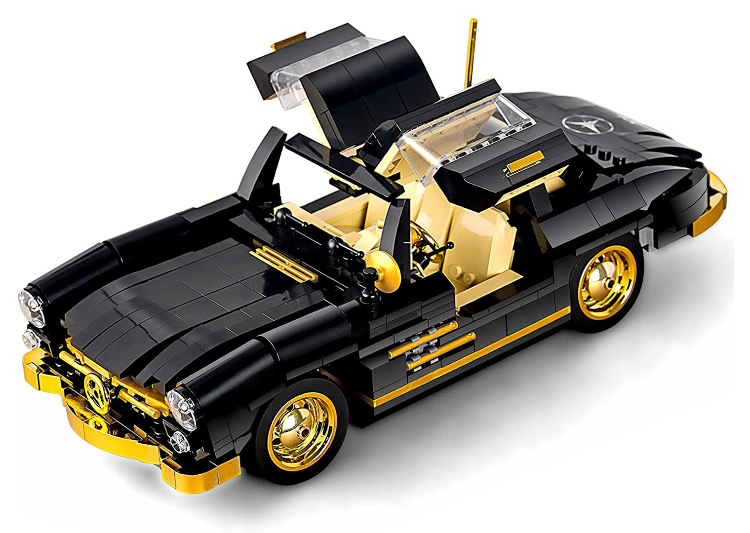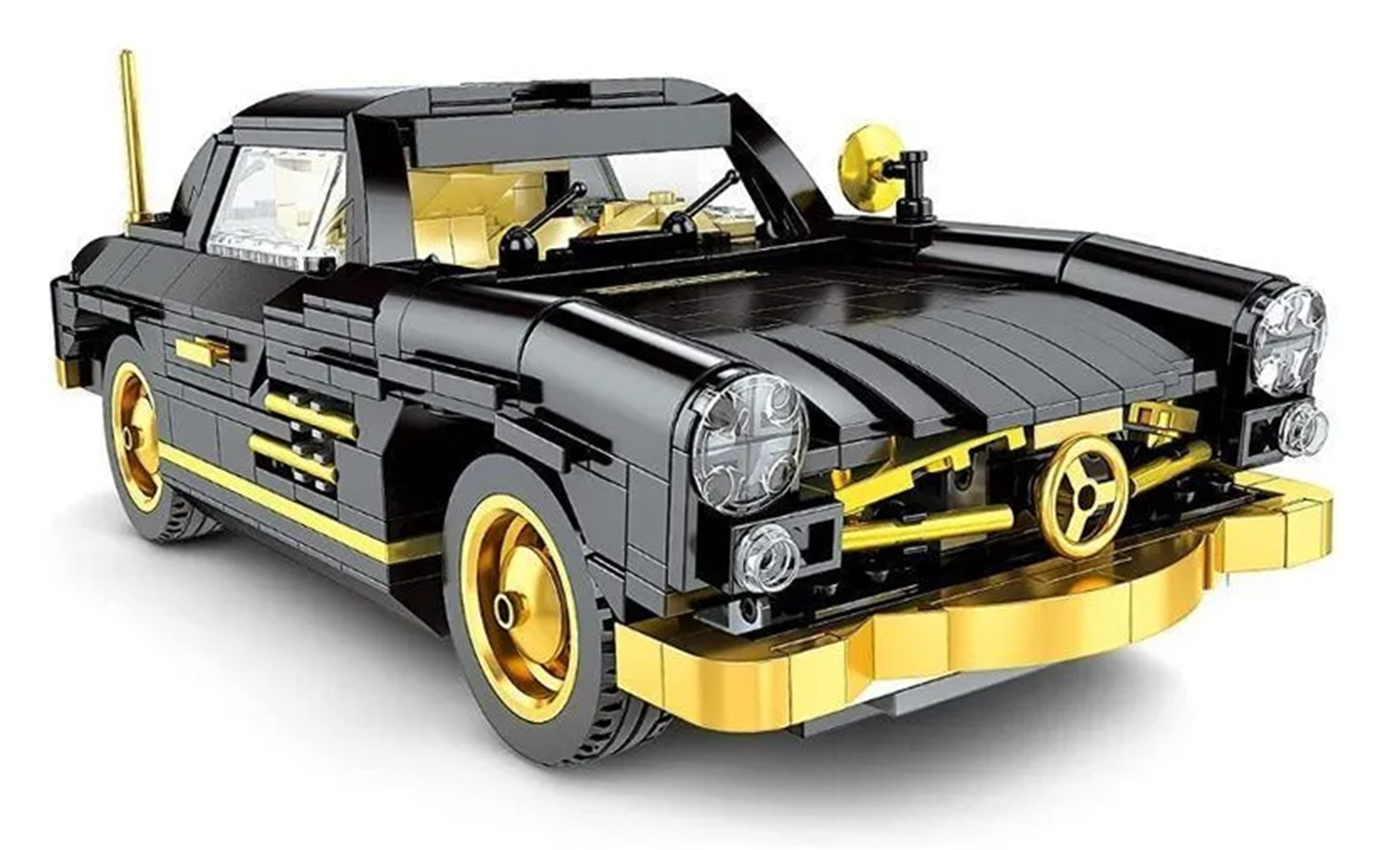 | Wysokiej jakości klocki konstrukcyjne dla dzieci od ósmego roku życia. Zestaw składa się z 886 elementów, z których zbudować można czarne auto retro. Ten wspaniały model samochodu z pewnością przyciągnie uwagę swoimi detalami. Złote elementy chromowane: koła, grill, zderzak, w pełni szczegółowe wnętrze. W tym modelu możemy otwierać drzwi boczne, maskę i bagażnik.