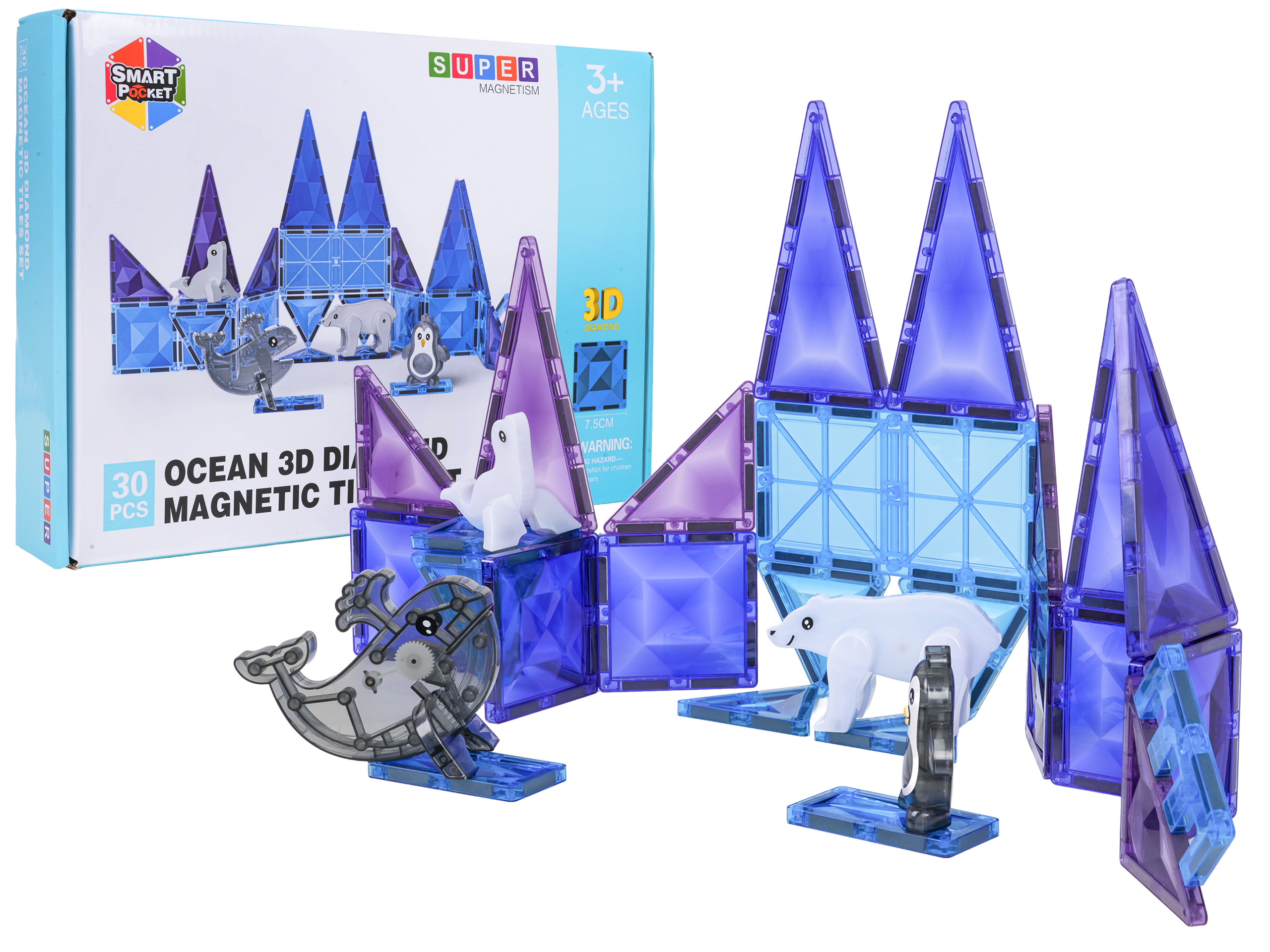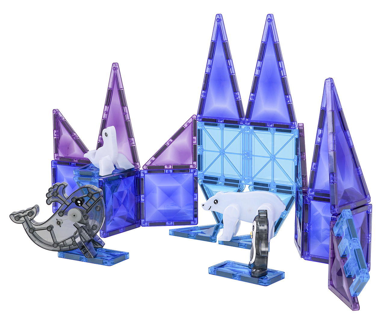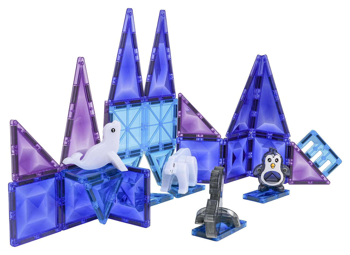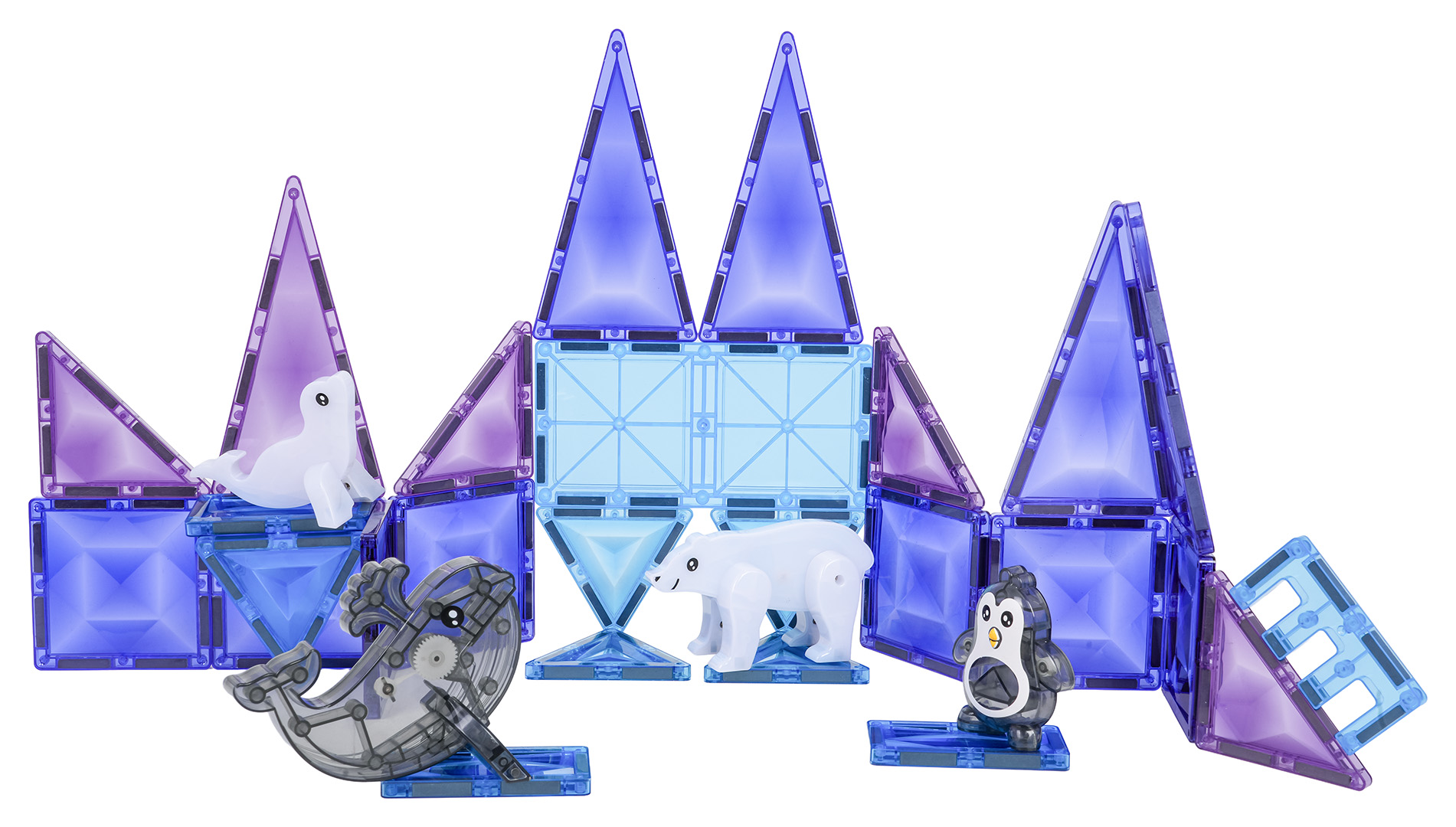 | Zestaw klocków magnetycznych o tematyce zimowej dla dzieci od trzeciego roku życia. Zestaw składa się z 30 elementów, klocków magnetycznych oraz magnetycznych postaci delfinka, pingwinka, foki i misia polarnego. Klocki magnetyczne wykonano z trwałego tworzywa sztucznego. Łączą się ze sobą za pomocą magnesów neodymowych. Możemy je łączyć w różnych konfiguracjach i pod różnymi kątami, tworząc konstrukcje 3D. Postacie posiadają ruchome elementy, delfinek otwiera paszczę, miś może poruszać nogami, pingwinek zaś podnosi i opuszcza łapy. Układanie klocków pozytywnie wpływa na rozwój kreatywności, uczy cierpliwości i skupienia.