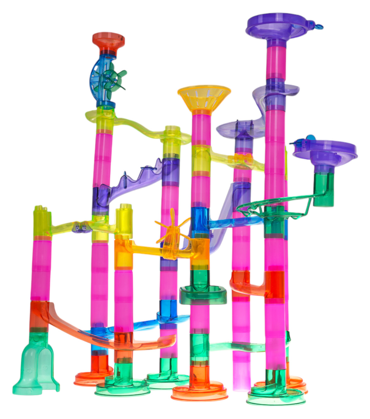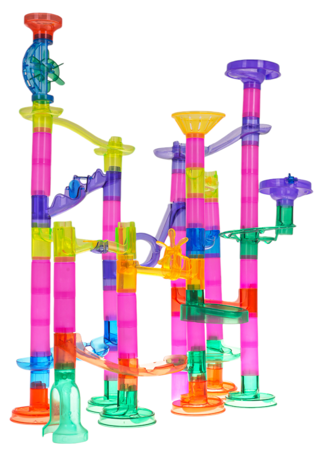 | Kolorowy, wytrzymały, tor do samodzielnego montażu z kuleczkami dla dzieci od 3 – go roku życia. Zabawa polega na samodzielnym zbudowaniu konstrukcji toru, a potem puszczaniu piłeczek tunelami. Puszczanie w ruch kuleczek i obserwowania jak pokonuje kręte tunele, daje mnóstwo radości, uspokaja i wycisza. Zabawka pozytywnie wpływa na rozwój kreatywności, wyobraźni i zdolności manualnych. Mrugające kuleczki zasilane są bateriami łącznie 10 x LR41.