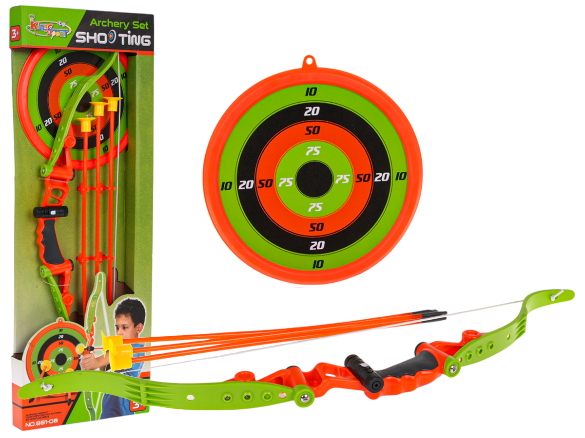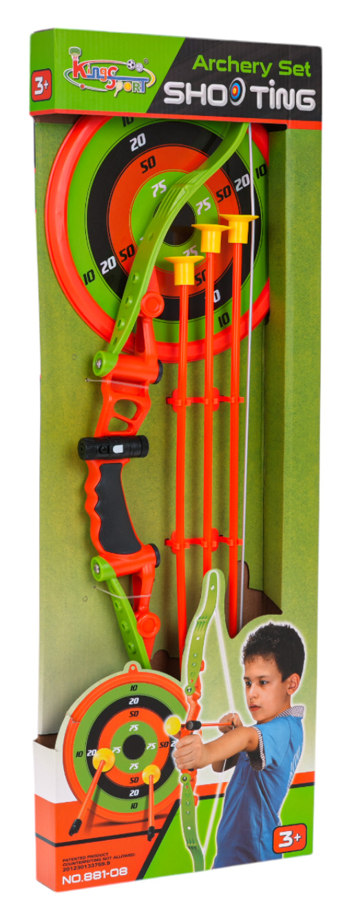 Wymiary | - łuk ok. 68,5 cm x 15,5 cm x 3,5 cm, - rzutka z przyssawką ok. 41 cm długości, - tarcza o średnicy ok. 23,5 cm, - opakowanie ok. 69,3 cm x 24,7 cm x 4,5 cm. |