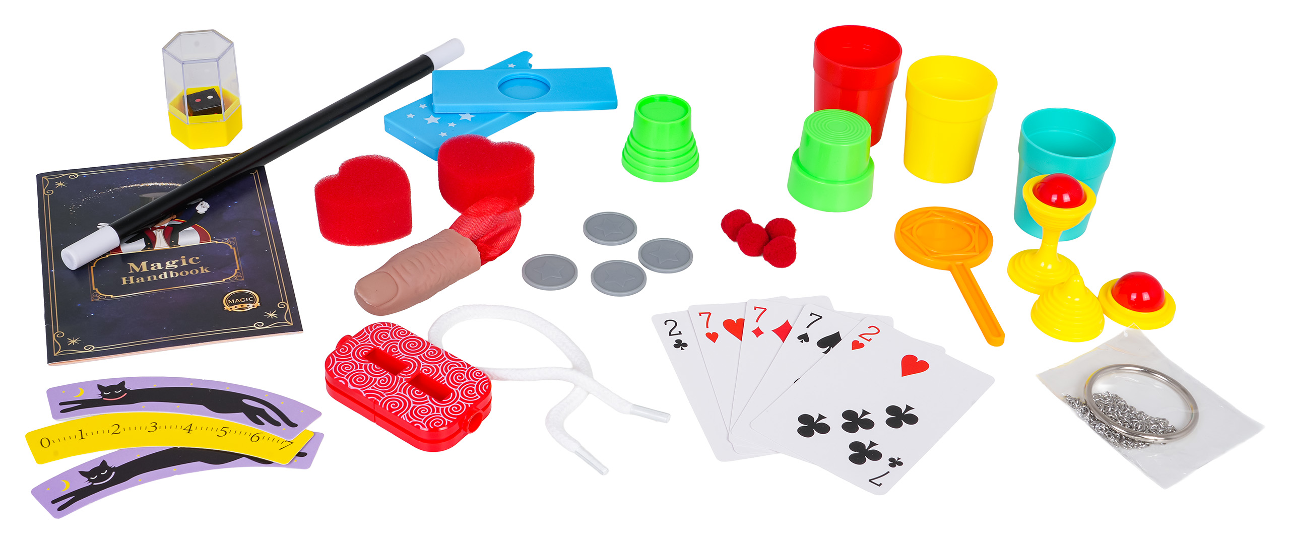| - instrukcja z 74 sztuczkami i kodami do filmów, - 5 x karta, - magiczna różdżka, - magiczne pudełko na monety, - 4 x moneta, - kubki do trików, - pudełko z kośćmi, - magiczny palec z chusteczką, - magiczny puchar z kulką, - magiczne kubki, - magiczne serca, - pierścień z łańcuszkiem, - sznurówka, - inne magiczne rekwizyty. |