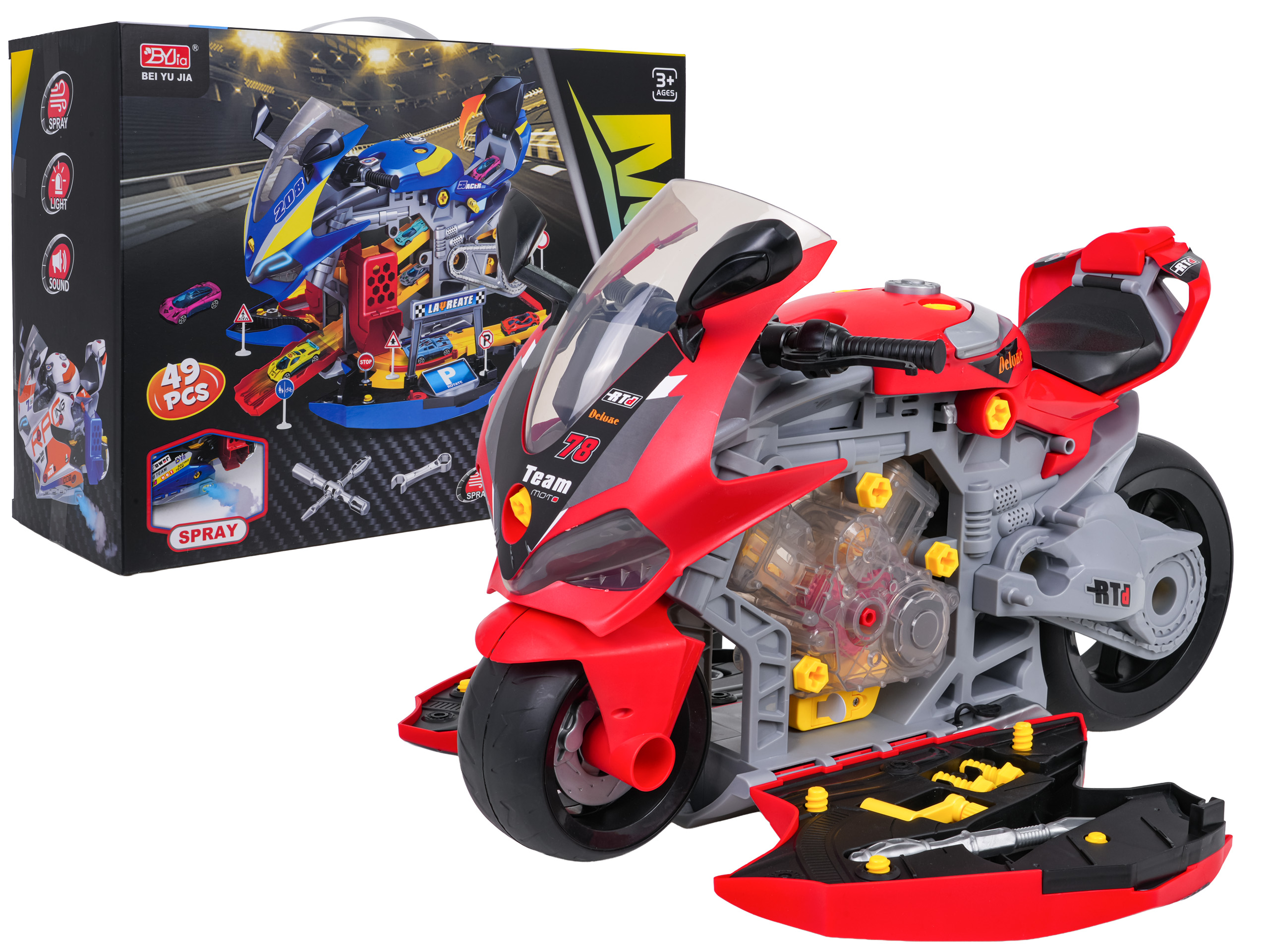 | Zabawka 2w1, duży motocykl z warsztatem dla dzieci od trzeciego roku życia. Motocykl posiada świecące przednie reflektory oraz tylne światła. Wydaje odgłosy startu, jazdy, przyspieszania, a z jego rury wydechowej wydobywa się dym (po uzupełnieniu zbiorniczka wodą). Boki motorka możemy otworzyć i wówczas zobaczymy silnik z podświetlanymi tłokami i odgłosami pracy. Silnik możemy wyjąć z motorka, by zgłębić jego mechanizm. W zestawie znajdują się klucze do rozkręcania i pipetka na wodę. Motorek posiada wygodną rączkę do przenoszenia, został wykonany z najlepszej jakości tworzywa sztucznego, pięknie się prezentuje. Zabawka zasilana jest bateriami typu 3 x AAA 1,5 V (baterii brak w zestawie), silnik bateriami typu 3 x AG13 (w zestawie). Funkcje: - dla dzieci od trzeciego roku życia, - wykonany z najlepszej jakości materiałów, - wygodna rączka do przenoszenia, - ruchome, duże kółeczka, - otwierane boki motorka, a w środku silnik i narzędzia, - efekty światła: reflektory, tylne światełka przy wylocie dymu, silnik, - efekty dźwięku: odgłosy startu, jazdy, przyspieszania, odgłosy pracy silnika, - dym wydobywający się z rury wydechowej, - idealny zestaw prezentowy dla dzieci ciekawych świata. |