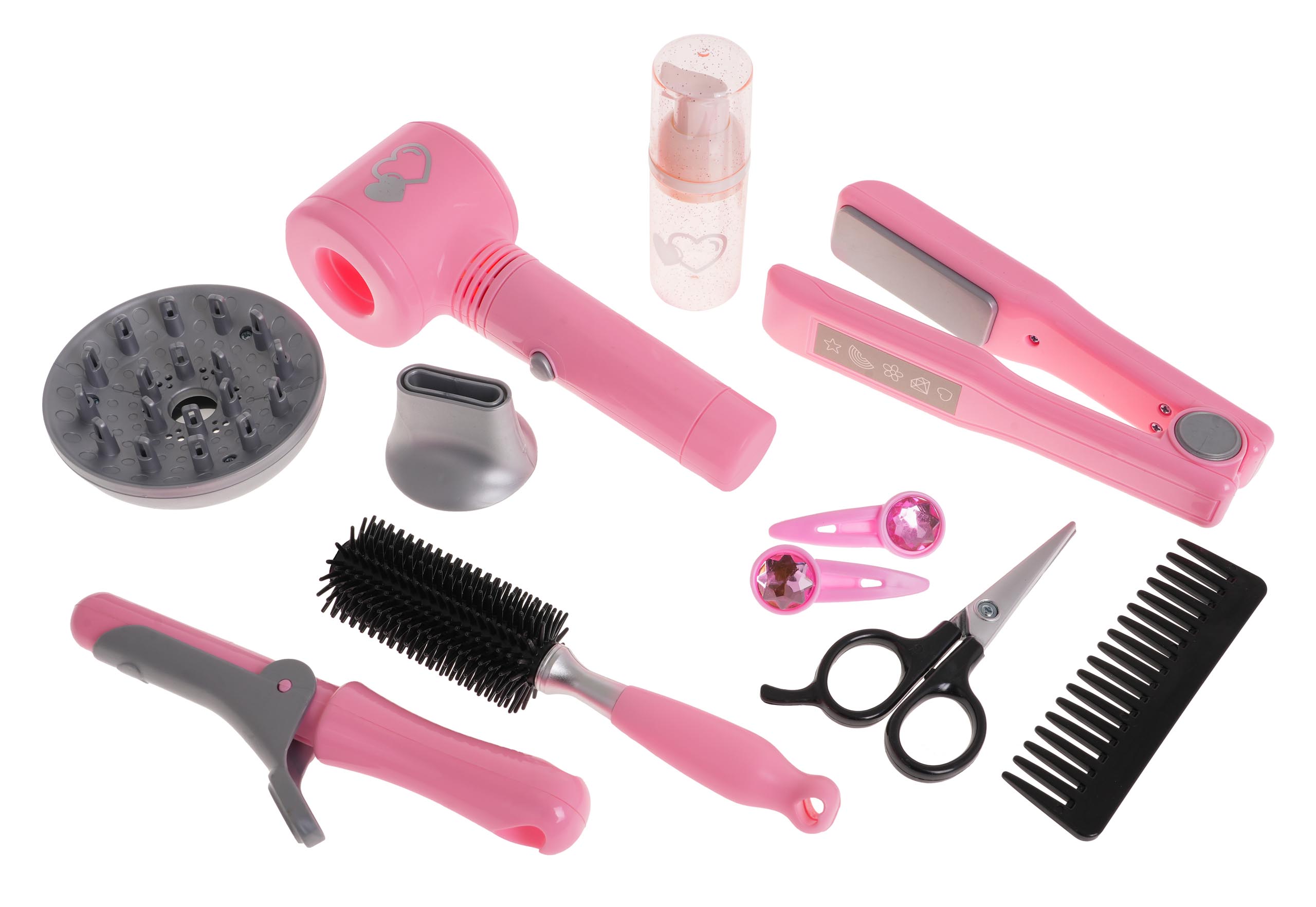 - suszarka do włosów, - wymienna nasadka do suszarki z dyfuzorem, - wymienna nasadka do suszarki z koncentratorem, - prostownica do włosów, - lokówka do włosów, - grzebień, - szczotka, - nożyczki, - butelka, - 2 x spinka do włosów. |