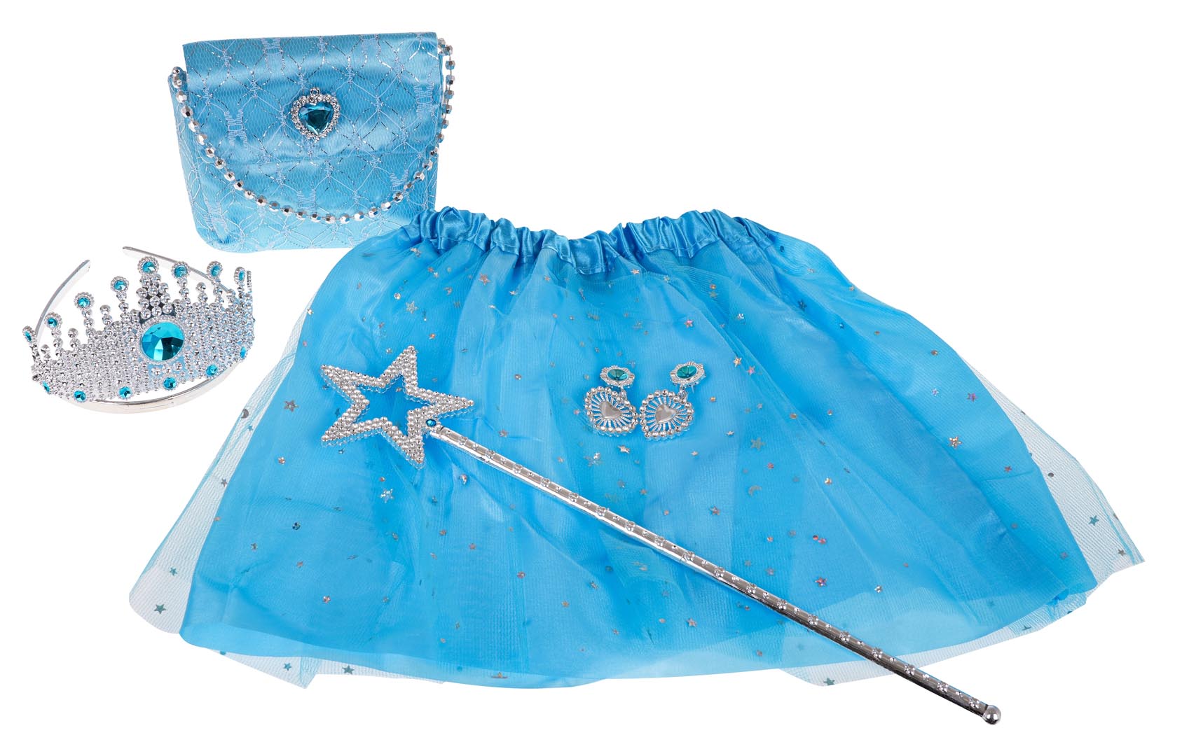Wymiary | - tiara ok. 11 cm x 12,5 cm x 7,5 cm, - kolczyki ok. 5 cm x 3 cm, - różdżka ok. 34 cm x 7,5 cm x 0,7 cm, - torebka ok. 14 cm x 13 cm x 2,5 cm, - spódnica długość ok. 28 cm, szerokość w pasie na płasko ok. 19 cm x 2, po maksymalnym naciągnięciu ok. 34 cm x 2, - opakowanie ok. 38 cm x 31 cm x 6 cm. |