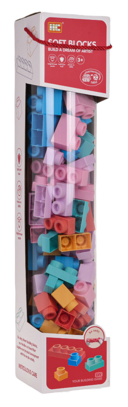 Zestaw kolorowych miękkich klocków dla dzieci od 3-go roku życia. Zestaw wykonano  z bezpiecznego dla dzieci i środowiska materiału PVC. Klocki są lekkie i nie posiadają ostrych zakończeń. Bardzo łatwo je utrzymać w czystości, po wyparzeniu, nie tracą kolorów. Klocuszki możemy dowolnie wyginać, a po wygięciu wracają do swojego poprzedniego kształtu.