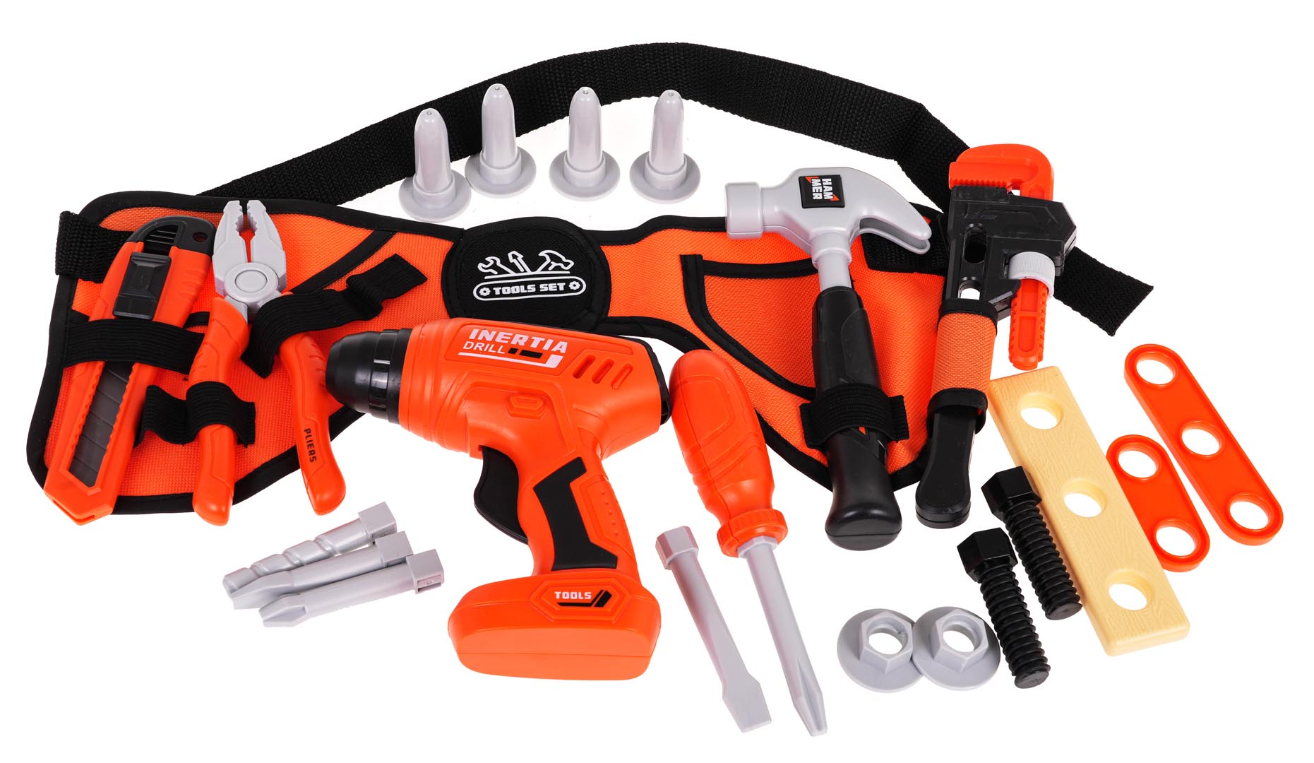 | - regulowany pas na narzędzia, - wkrętarka, - 3 wymienne końcówki do wkrętarki, - nasadka do śrubokręta, - 2 wymienne końcówki do śrubokręta, - kombinerki, - klucz francuski, - nóż, - młotek, - 2 elementy do wkręcania śrubek, - 1 drewienko do wkręcania śrubek, - 2 śruby, - 2 nasadki, - 4 kołki rozporowe. |