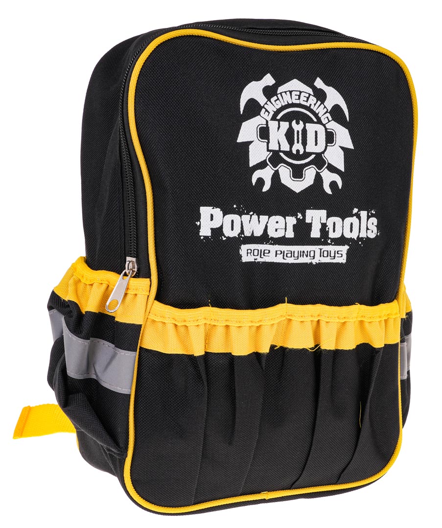 | Bogato wyposażony zestaw narzędzi z plecakiem na narzędzia i interaktywną wiertarko-wkrętarką dla dzieci od 3-go roku życia. Zestaw wykonano z najlepszej jakości plastiku. Plecak na narzędzia posiada główną komorę zamykaną na zamek błyskawiczny, małe kieszonki po bokach oraz przeszycia, które pomieszczą narzędzia. Wiertarko-wkrętarka zasilana jest bateriami typu 3 x AAA 1,5V (brak w zestawie) wkręca i wykręca, dodatkowo posiada wyjmowany akumulator jak w prawdziwej wiertarce, wymienne bity i świeci podczas pracy. W zestawie znajduje się, aż 28 elementów, prócz plecaka i wiertarko-wkrętarki mamy także: metr, młotek, kombinerki, kluczek, kątownik, śrubki, kołki, elementy do wkręcania.