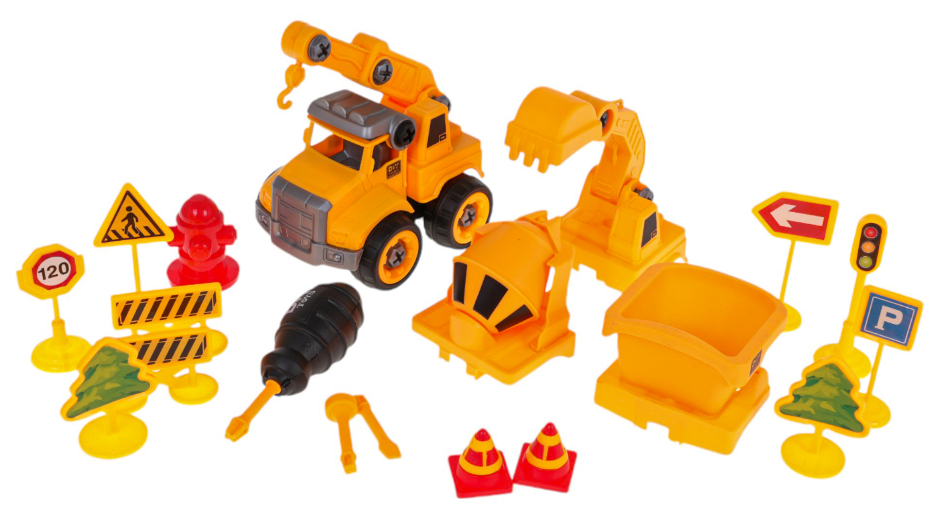 | - autko budowlane, - przyczepa, - gruszka do betonu, - wysięgnik, - łyżka koparki, - znaki drogowe, hydrant, drzewko, barierki, - śrubokręt z wymiennymi bitami, - pachołki, - instrukcja. |