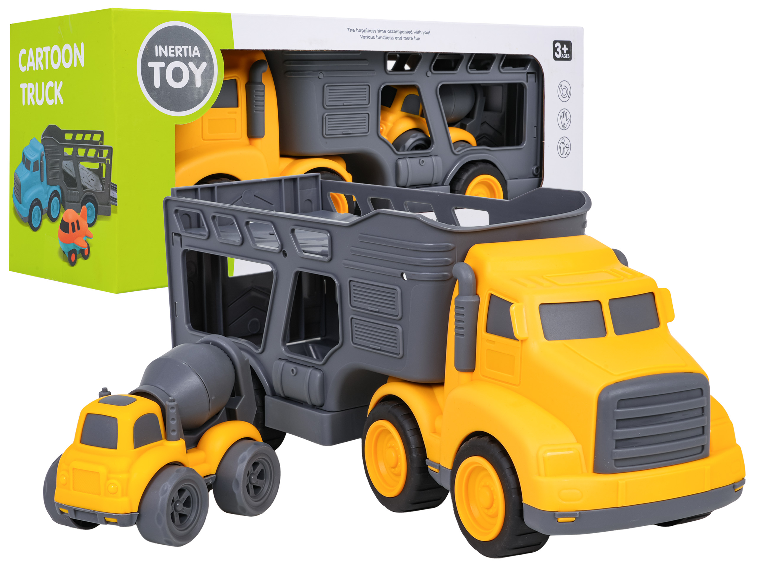 Funkcje: - dla dzieci od trzeciego roku życia, - zestaw wykonany z najlepszej jakości tworzywa sztucznego w żywych kolorach, - idealny zestaw prezentowy dla miłośników pojazdów budowlanych, - możliwość odłączenia lawety od pojazdu, - otwierana tylna klapa lawety, - napęd w autku budowlanym, - możliwość obracania gruszką do betonu. |