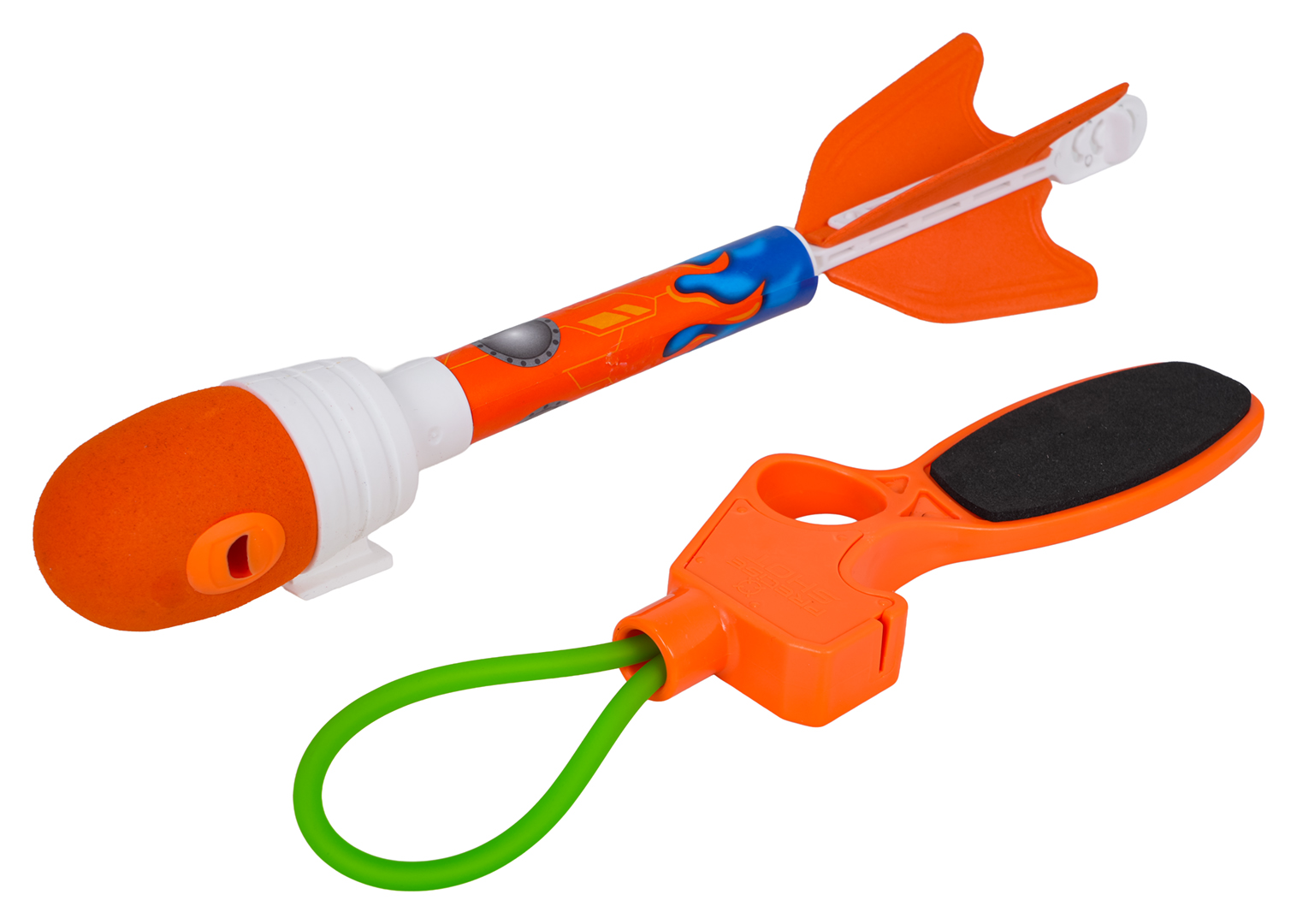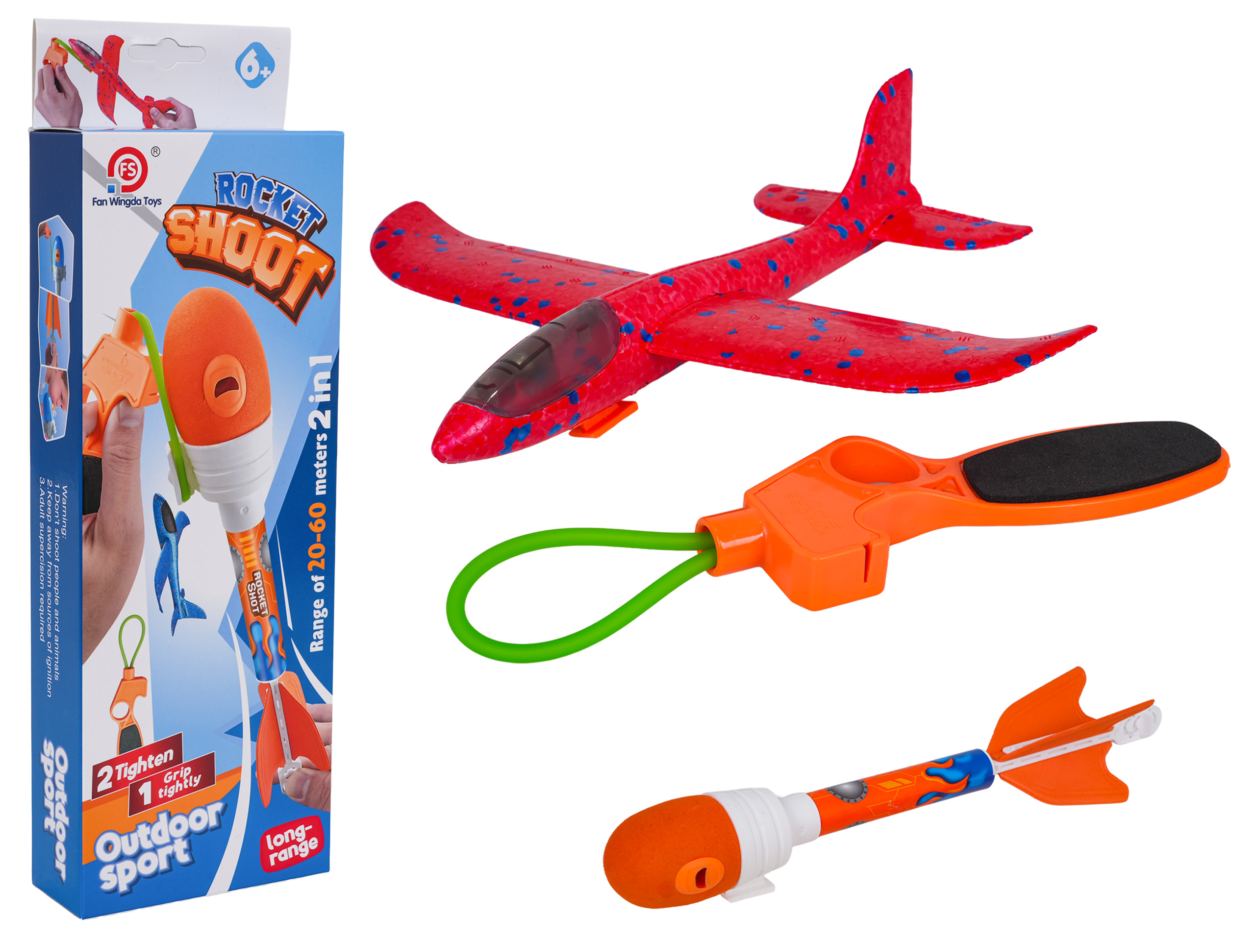 | Idealny zestaw do zabawy na świeżym powietrzu, lekki, aerodynamicznie ukształtowany samolot, proca i rakieta dla dzieci od trzeciego roku życia. Samolocik wykonano z lekkiego styropianu, jest wytrzymały, a dzięki swej lekkości po wystrzeleniu może przelecieć 20 do 60 metrów. Rakieta posiada gumowe zakończenie, co zwiększa bezpieczeństwo jej używania. Do zestawu dołączona jest proca z gumką. Wystarczy zaczepić gumkę o element samolotu lub rakiety i wystrzelić je na dużą odległość. Wspaniała zabawa gwarantowana. Zestaw nie posiada ostrych krawędzi, jest łatwy w użyciu i bezpieczny dla dzieci. Rakieta zasilana jest bateriami (w zestawie). Po uderzeniu w cel jej korpus rozświetla się kolorami. W górnej części rakiety jest też gwizdek.