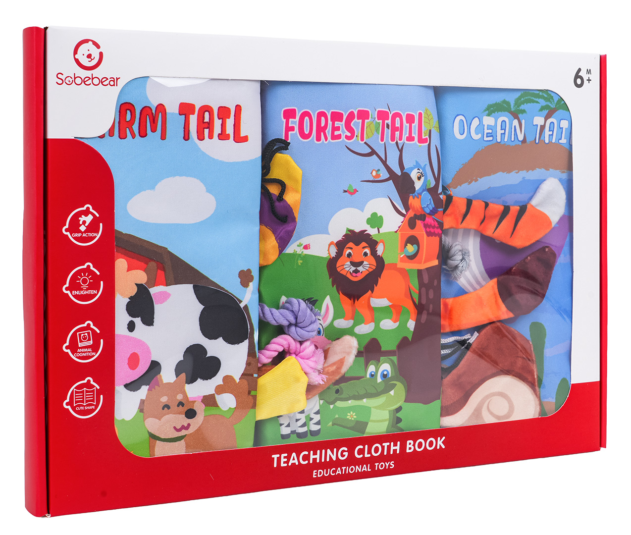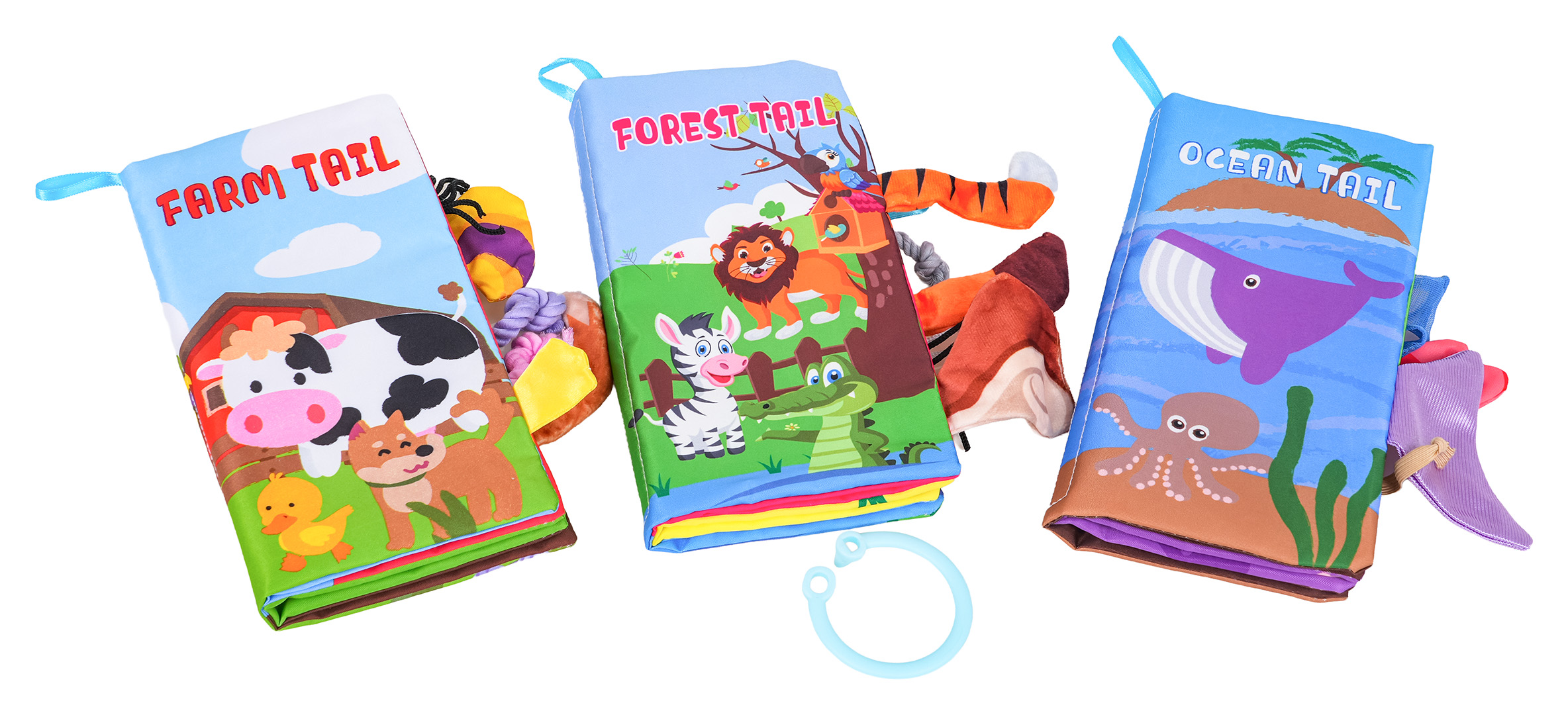 | - 3 miękkie książeczki z ogonkami zwierzaków. - zawieszka do książek. |