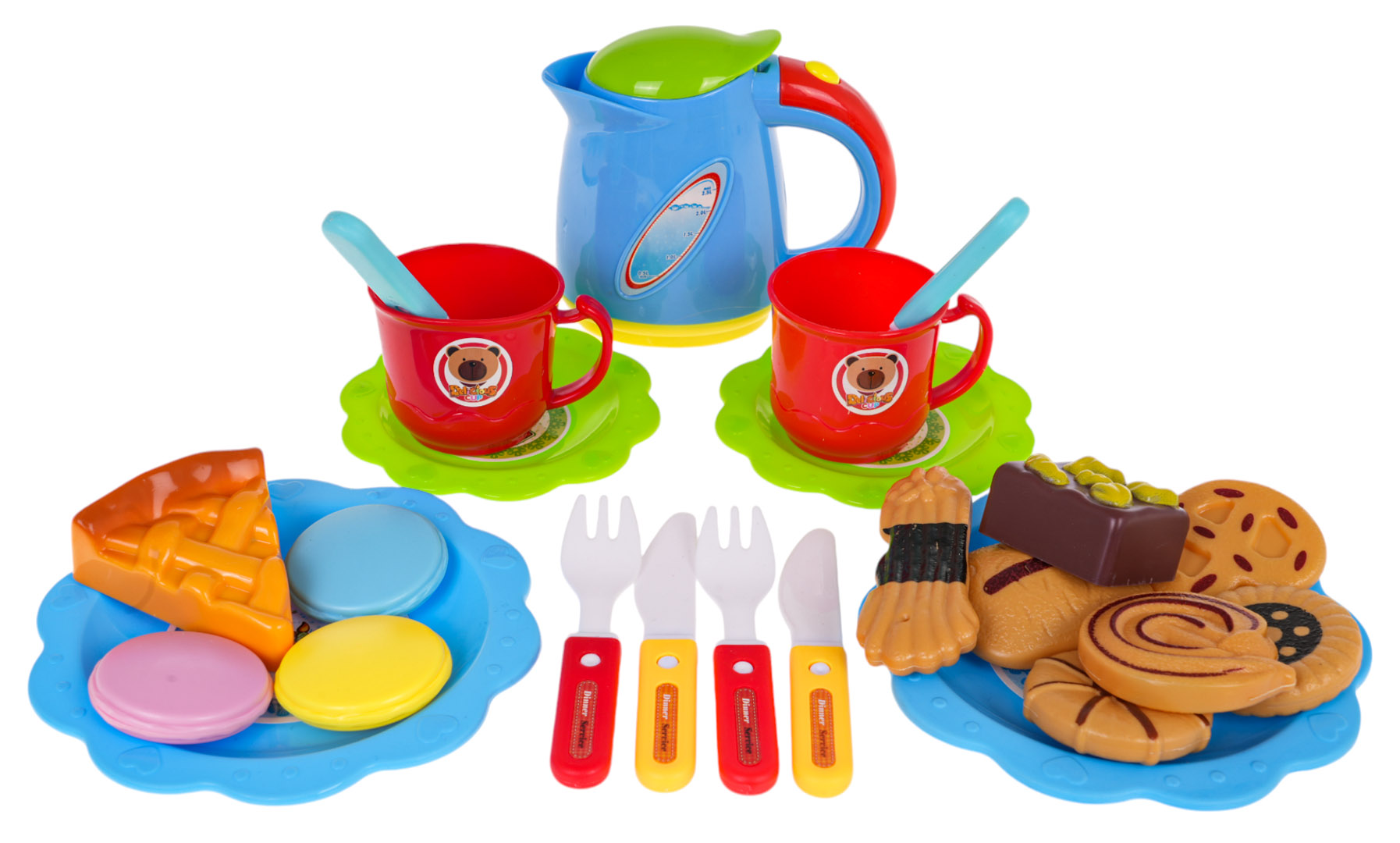 | - 6 kawałków tortu ( w całości ok. ok. 8,5 cm x 15 cm), - 7 świeczek w tym jedna większa, świecąca (ok. 7 cm x 2 cm – świeczka duża, 4,5 x 0.5 cm – świeczka mała), - 12 bez (ok. 2 cm x 2 cm), - 5 wisienek (ok. 4,5 cm x 2,5 cm), - miś (ok. 6 cm x 3,5 cm), - 4 kiwi (ok. 2,5 cm x 2,5 cm), - 5 truskawek (ok. 2,5 cm x 1,5 cm), - 5 mandarynek (ok. 2,5 cm x 1,5 cm), - 5 pałeczek lukrowych (ok. 2,5 cm x 1,5 cm), - 2 babeczki (ok. 5 cm x 6 cm), - 11 różnych ciasteczek (różne kształty, wymiary ok. 6 cm x 5 cm), - 3 kawałki rolady (w całości ok. 7,5 cm x 7,5 cm x 6 cm), - 2 nożyki mniejsze (ok. 11 cm x 2 cm), - nożyk duży (14 cm x 2,5 cm), - 2 łyżeczki ok. 10 cm x 2,5 cm, - 2 widelce ok. 10 cm x 2,5 cm, - 2 kubeczki (ok. 5 cm x 7 cm), - roladka ok. 7,5 cm x 6,5 cm, - 4 talerzyki (małe ok. 10 cm średnica, duże ok. 13,5 cm średnica), - czajnik ok. 10 cm x 11 cm x 4 cm, - gwizdek - naklejki dekoracyjne. |