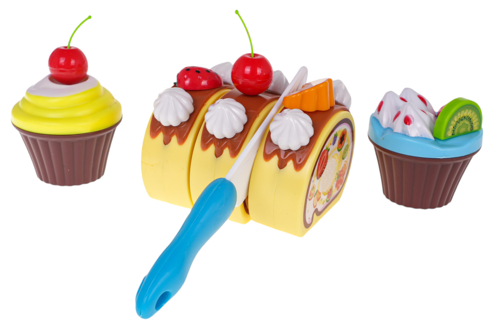 Funkcje zestawu: - przeznaczony dla dzieci od 3-go roku życia, - wykonany z najlepszej jakości plastiku w żywych kolorach, - bogate wyposażenie, - tort i roladka jest na rzepy, można je „kroić” oraz dekorować, - efekty świetlne – świeca świecąca dwoma kolorami. |