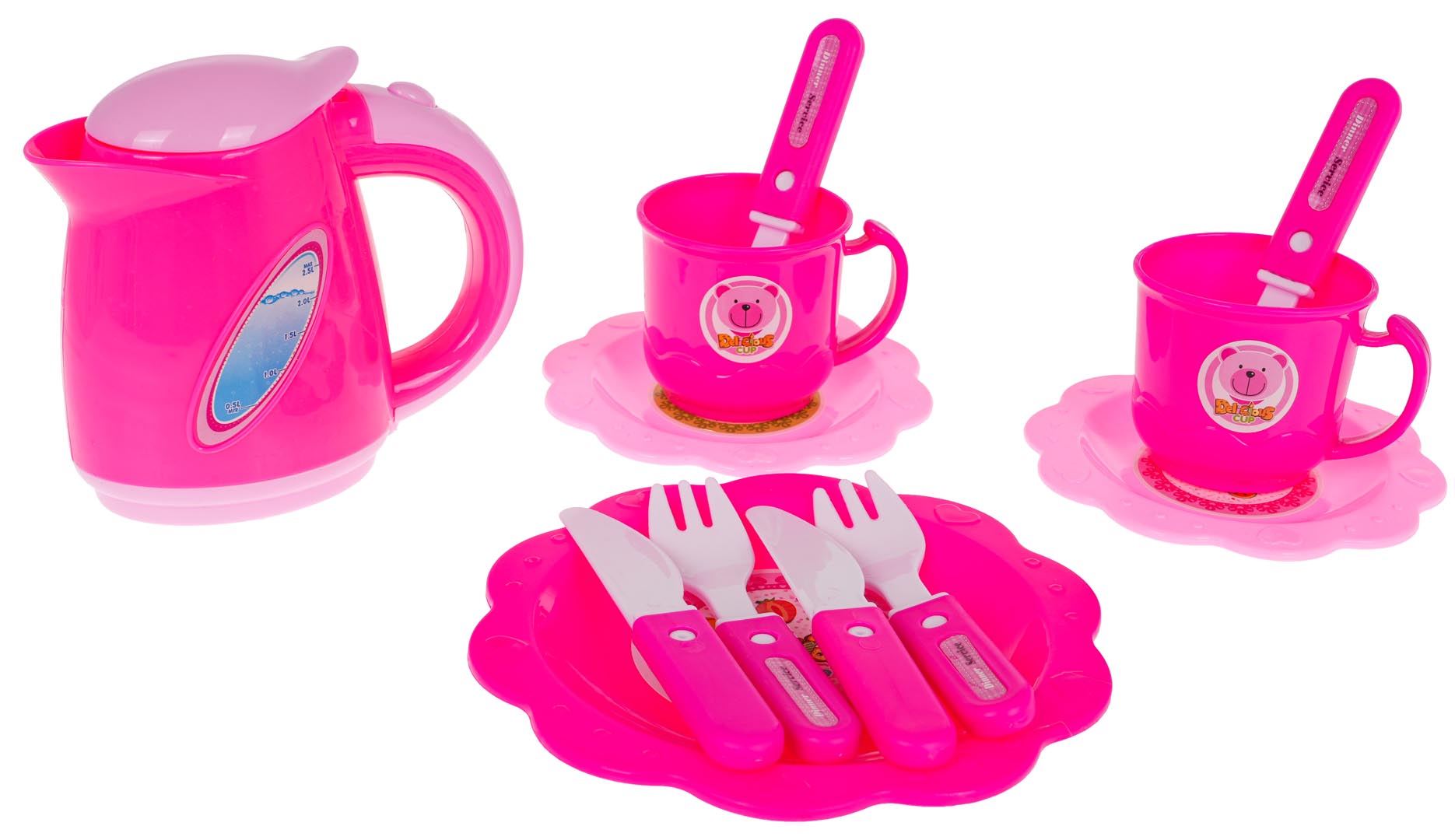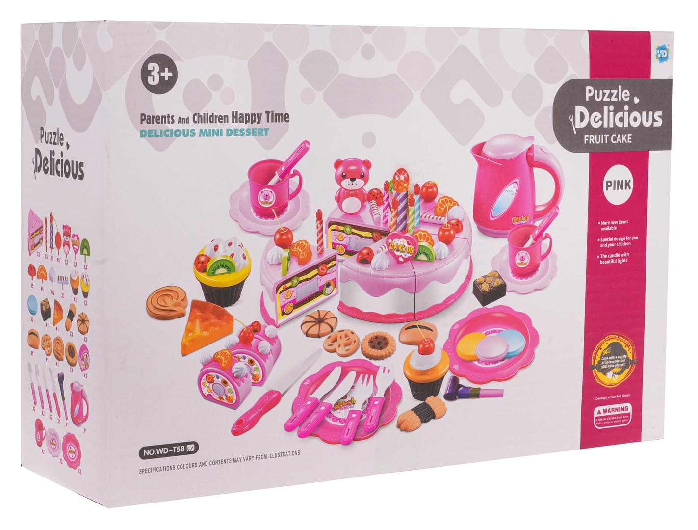 | - 6 kawałków tortu ( w całości ok. ok. 8,5 cm x 15 cm), - 7 świeczek w tym jedna większa, świecąca (ok. 7 cm x 2 cm – świeczka duża, 4,5 x 0.5 cm – świeczka mała), - 12 bez (ok. 2 cm x 2 cm), - 5 wisienek (ok. 4,5 cm x 2,5 cm), - miś (ok. 6 cm x 3,5 cm), - 4 kiwi (ok. 2,5 cm x 2,5 cm), - 5 truskawek (ok. 2,5 cm x 1,5 cm), - 5 mandarynek (ok. 2,5 cm x 1,5 cm), - 5 pałeczek lukrowych (ok. 2,5 cm x 1,5 cm), - 2 babeczki (ok. 5 cm x 6 cm), - 11 różnych ciasteczek (różne kształty, wymiary ok. 6 cm x 5 cm), - 3 kawałki rolady (w całości ok. 7,5 cm x 7,5 cm x 6 cm), - 2 nożyki mniejsze (ok. 11 cm x 2 cm), - nożyk duży (14 cm x 2,5 cm), - 2 łyżeczki ok. 10 cm x 2,5 cm, - 2 widelce ok. 10 cm x 2,5 cm, - 2 kubeczki (ok. 5 cm x 7 cm), - roladka ok. 7,5 cm x 6,5 cm, - 4 talerzyki (małe ok. 10 cm średnica, duże ok. 13,5 cm średnica), - czajnik ok. 10 cm x 11 cm x 4 cm, - gwizdek - naklejki dekoracyjne. |