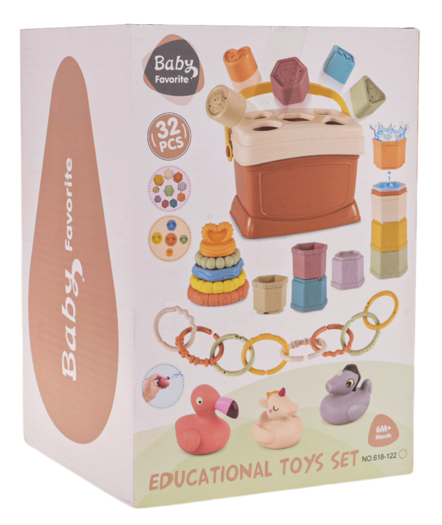 | Zestaw kolorowych zabawek edukacyjnych dla maluszków od 6-go miesiąca życia. W skład zestawu wchodzi sorter kształtów z wygodną rączką do przenoszenia, klocuszki, gumowe zwierzaki, piramidki do układania wieży, okręgi konstrukcyjne i elementy do wpinania. Różnorodne kolory i kształty przyciągają wzrok maluszka i zachęcają do zabawy. Funkcje zestawu: - uczy kolorów i kształtów, - uczy budować konstrukcję, układać elementy na sobie, - pobudza zmysły maluszka kolorami i różnorodnością elementów, - daje wiele możliwości zabawy, - uczy utrzymania porządku, wszystkie elementy zestawu można schować po skończonej zabawie do boxu, - idealna zabawka do domu, do kąpieli czy do piasku. |
